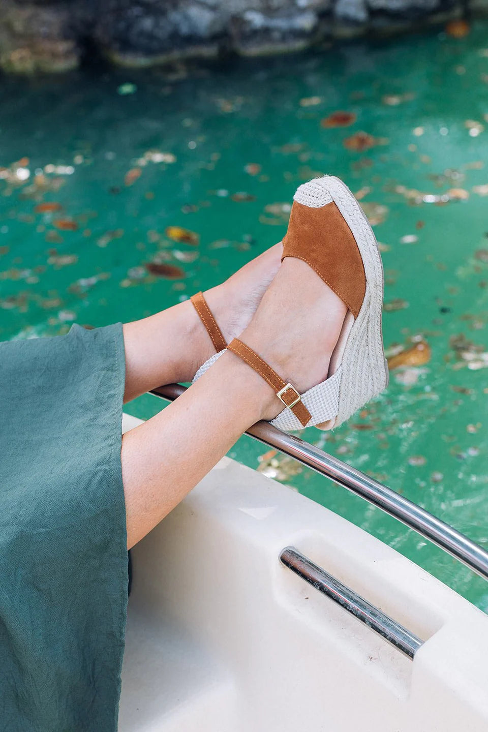 Scarpe slingback tipo espadrillias in pelle. Tacco alto a forma di zeppa. Fascette in tessuto da allacciare alla caviglia.