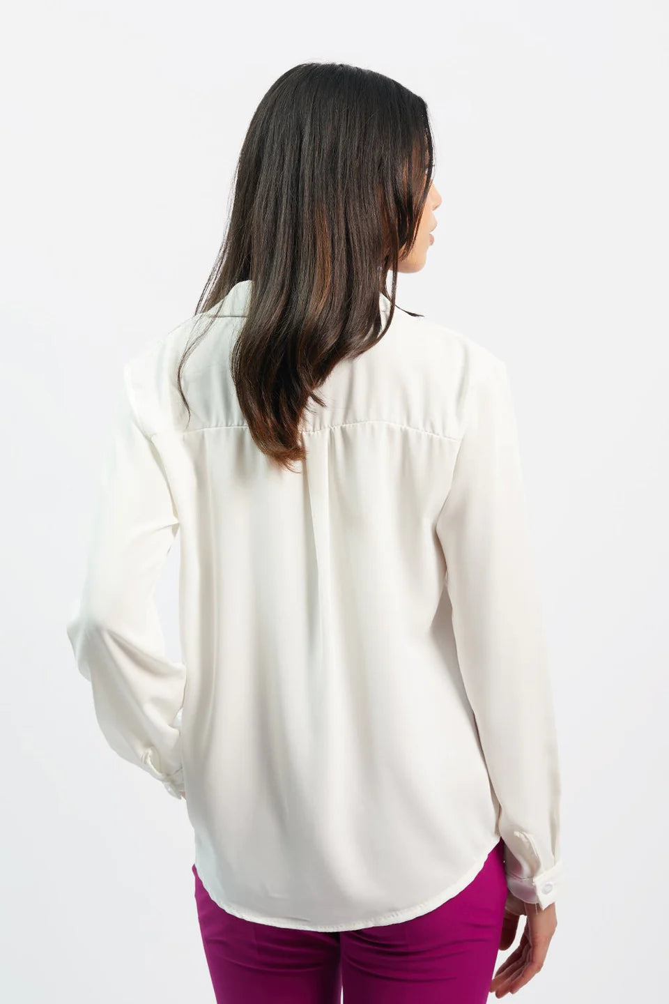 Camicia morbida satinata con colletto e maniche lunghe. Chiusura anteriore con bottoni.